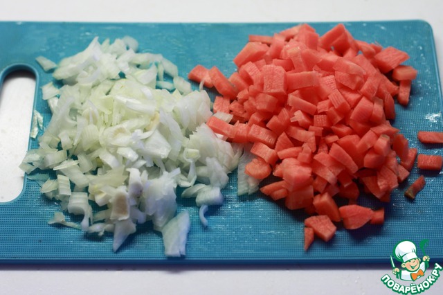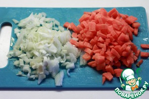 Для соуса к рису нарежьте кубиком репчатый лук и морковь.