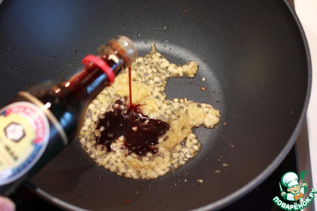 Через минуту выловите шумовкой перцы и всыпьте в ароматное масло имбирь и чеснок, обжарьте 30 секунд и добавьте соевый соус.
