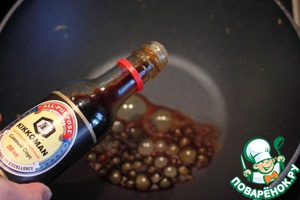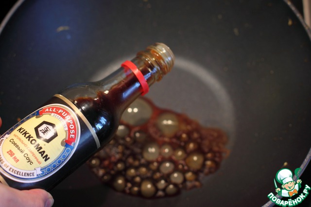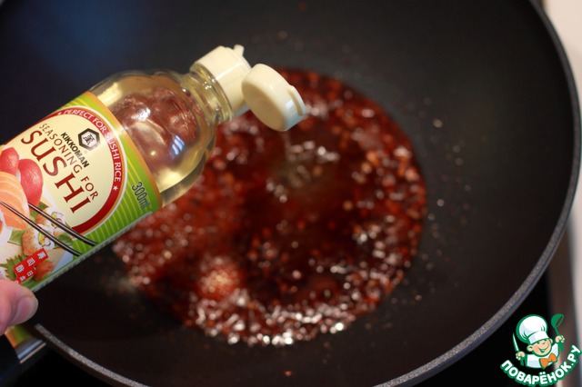 И рисовый уксус. Хорошо перемешайте и уварите соус примерно на треть. Он немного загустеет и карамелизуется.