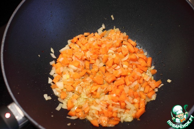 Влейте намного масла в вок и добавьте лук (жарим, помешивая, 30 секунд), затем морковь (еще 30 секунд).