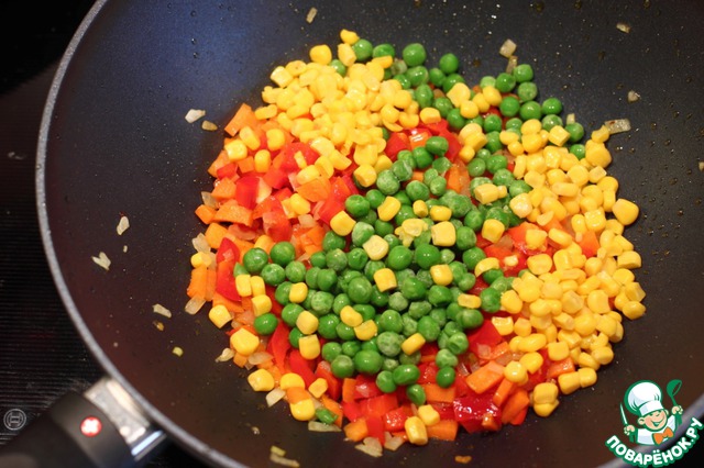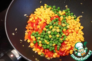 Всыпьте кукурузу и зеленый горошек и жарьте еще пару минут. Переложите готовые овощи на тарелку.