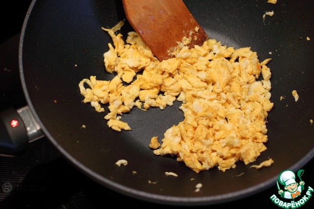 В мисочке взболтайте яйца и вылейте их в вок. Постоянно перемешивая, обжарьте, формируя хлопья. Переложите яйца к овощам.