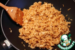 Всыпьте отварной рис и быстро перемешайте, чтобы весь рис покрылся соусом.