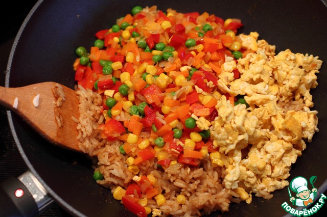 Добавьте к рису овощи и хлопья из яйца, перемешайте в последний раз и обжарьте все вместе в течение минуты.