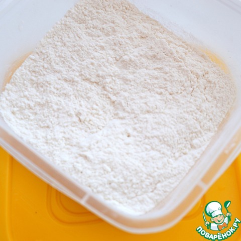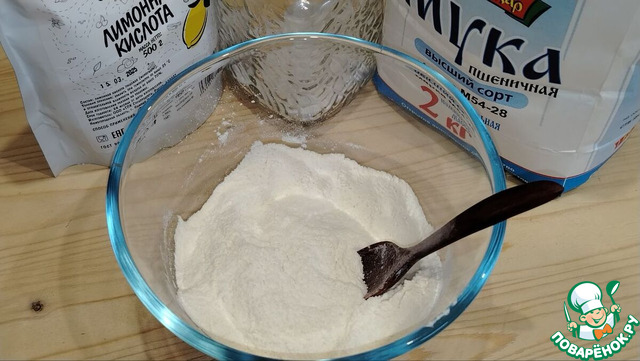 Для разрыхлителя взять лимонную кислоту, соду, муку - все тщательно смешать.