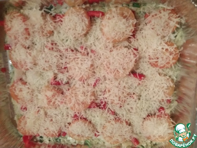 Если у Вас кабачки "постарше", то натёртый кабачок, перед тем как приступить к следующему шагу, нужно отжать. Иначе лишняя влага не даст как следует пропечься "тесту", и вместо основы Вы получите кашу. -