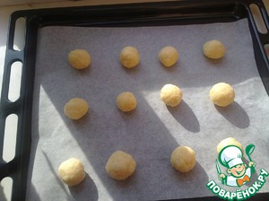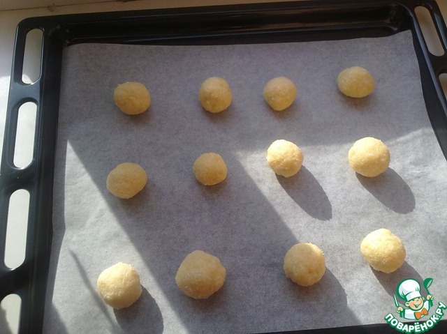 Достать тесто. Руки смочить водой и сформировать из теста шарик. Выпекать при температуре 180 гр. С. около 15 мин.