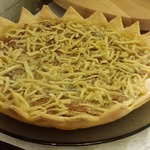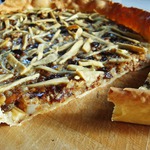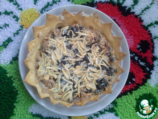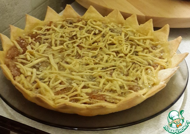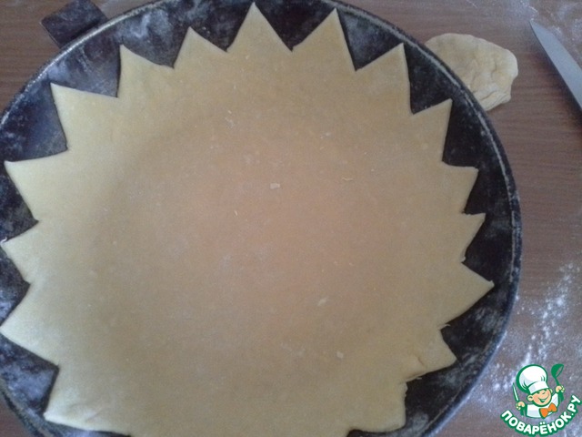 Тесто раскатайте тоненько по размеру вашей формы - чтобы хватило на надежные бортики. Выложите пласт теста в присыпанную мукой форму и вырежьте по краям "лепестки" подсолнуха.