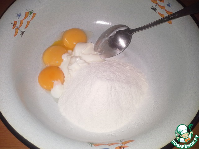 К желткам добавьте сметану и замесите крутое тесто, которое будет легко раскатываться, ни к чему не прилипая. Я написала - 1 стакан муки, но на деле я точно даже и не знаю, сколько там... сыплю, пока результат меня не устроит.