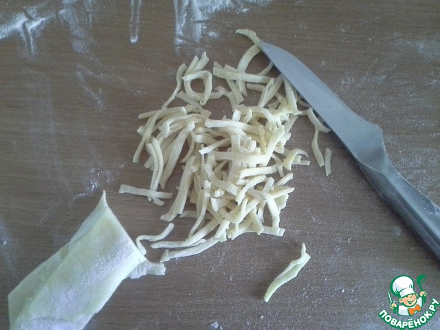 Обрезки теста смешайте с отщипнутым ранее кусочком, тоненько раскатайте и порежьте на короткую "лапшу".