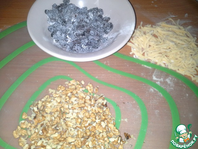Приготовьте начинку: орехи порубите ножом (не очень мелко), вымытый и обсушенный изюм обваляйте в муке.