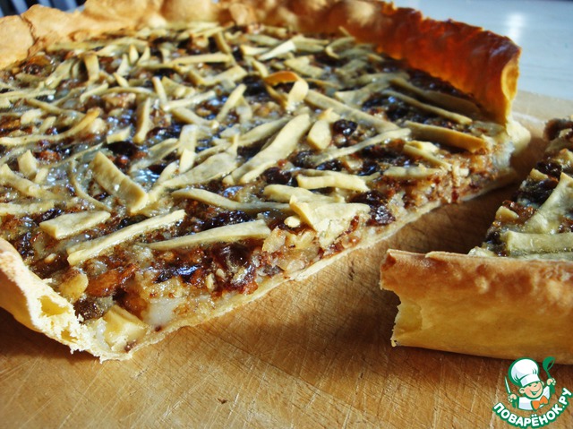 Выкладываем на пирог (или В пирог? :)) орехи, изюм, заливаем сладкими (не взбитыми!) белками, сверху посыпаем "лапшичкой".