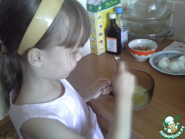 Отделите белки от желтков. Белки смешайте с сахаром (не взбивать! просто размешайте - мне на этом этапе вызвалась помочь моя краса) и уберите в холодильник.