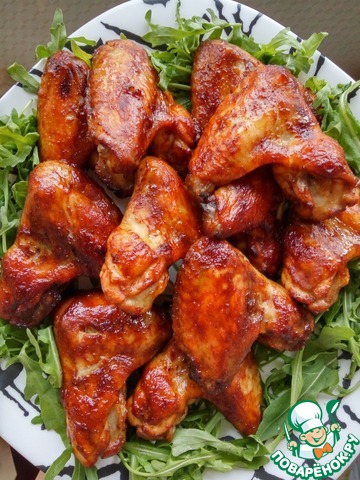 Смешать крылышки с маринадом и убрать в холодильник на 1-2 часа. Потом выложить их на смазанный противень и запечь до готовности при температуре 200°. Если будет много сока, то слейте его.