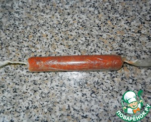 На столе развернуть пищевую плёнку и отрезать необходимый кусочек. Выложить фарш, сформовать сосиску.