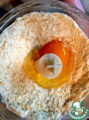 В чаше блендера смешать сливочное масло, муку и 50 г сахара до образования однородной крошки, добавить яйцо, еще раз перемешать, тесто должно получиться рассыпчатым, у меня получилось густовато, и я добавила еще 1 ст. л. холодной воды.