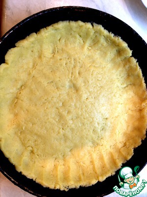 Форму для выпекания (у меня диаметр 23 см) смазать маслом и хорошенько утрамбовать тесто толщиной где-то 4-5 мм и сформировать бортики. Поставить основу для пирога в разогретую духовку на 10 мин.