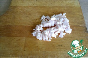 Сало режем мелко, выкладываем на горячую толстостенную сковороду и вытапливаем жир. Аккуратно, чтобы не обжечься, вылавливаем шкварки.