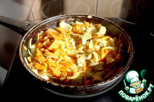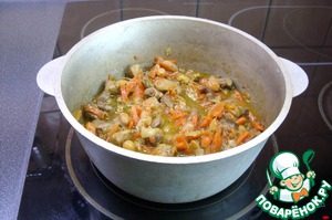 На раскаленную сковороду выкладываем свинину и обжариваем её до появления золотистой корочки. Убавляем нагрев в два раза и выкладываем лук. Обжариваем его минут 5, убавляем нагрев, выкладываем морковь и обжариваем все, пока не выпарится вся вода. Добавляем свежемолотые специи и половину соли. Одновременно в отдельной кастрюле отвариваем фасоль.