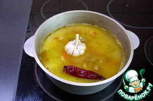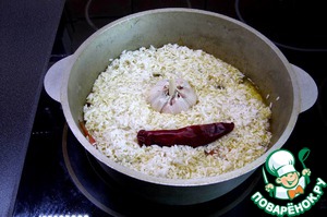 Увеличиваем нагрев. Добавляем рис, головку чеснока, стручок перца (если он не имеет повреждений кожицы, то никакой страшной жгучести плову он не придаст). Добавляем остаток соли.