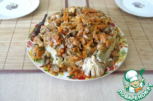 Перекладываем мясо с овощами в подходящую для плова посуду (труднодостижимый идеал - чугунный казан). Добавляем изюм и курагу. Заливаем все кипятком (вода должна лишь слегка покрыть мясо). Сразу же отвариваем почки в отдельной кастрюле в течение 5 мин. Воду сливаем, а почки добавляем в казан. Тушим все под крышкой до полуготовности мяса.