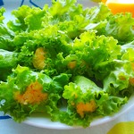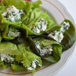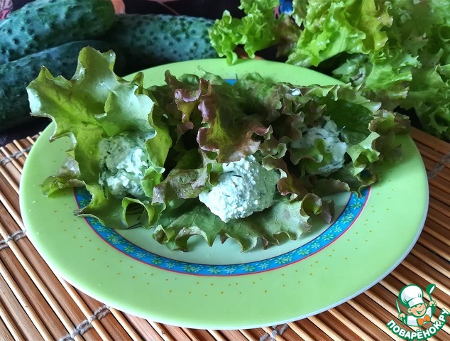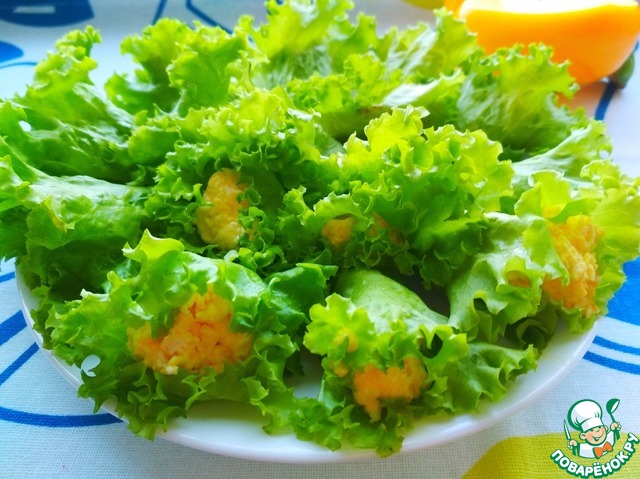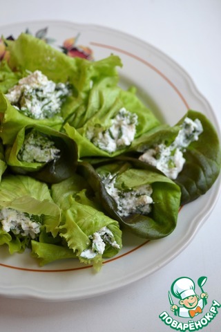 Листья салата помыть, высушить на полотенце, разрезать пополам, удалив утолщение, на каждый положить чайную ложку начинки.