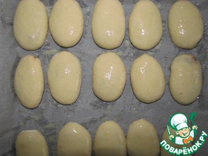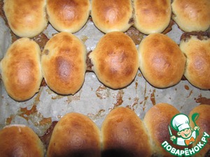 Пирожки положить на противень швом вниз, смазать желтком, разведенным водой и солью. Дать пирожкам подняться в течение 30 минут. Выпекать при 180 градусах 14-17 минут.