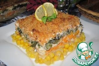 Когда заливка готова, высыпаем в форму макароны, сверху укладываем рыбу и заливаем аккуратно заливкой...