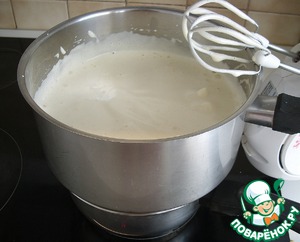 Следите, чтобы дно кастрюли не касалось воды, а сама вода не кипела. Продолжайте взбивать яйца миксиром до побеления и увеличения массы в три раза (около 10 минут). Снять с огня.