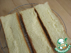 Холодный бисквит разрезать вдоль на три одинаковые части.