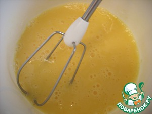 В яичную смесь просеять в два подхода муку, деликатно перемешать. Аккуратно влить растопленное и охлажденное сливочное масло (60 гр). Еще раз перемешать.