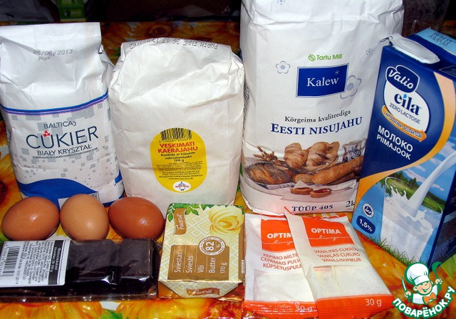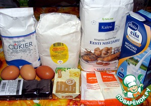 Ингредиенты для теста - мука овсяная, пшеничная, сахарный песок, сливочное масло, молоко, ванилин, разрыхлитель теста, яйца. Начинка - шоколад, брусника.