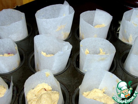 Теста получилось много, но я задумала испечь только 20 штук. Использовала сплошную форму с 12 - ти ячейками и 8 селиконовых. Ячейки формы смазала маслом и в каждую по бокам положила пергамент, чтобы тесто не выползало через край, когда будет увеличиваться в размерах.