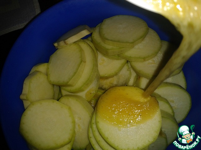Кабачки нарезать кружками, но не очень тонко (чтоб не просвечивались, приблизительно по 3-4 миллиметра). Отдельно в мисочке сбить яйцо с солью и перцем, можно добавить приправу или пряности (но чуть-чуть, чтобы не перебить вкус кабачка). Тогда вылить яйцо в кабачки и перемешать.