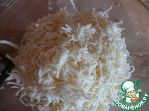 На мелкой терке потереть сыр и к яйцам.