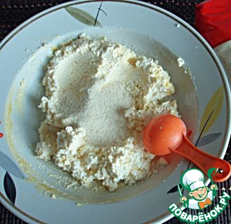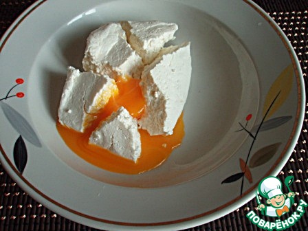 Отделяем белок от желтка. Белок отставляем, а желток смешиваем с творогом.