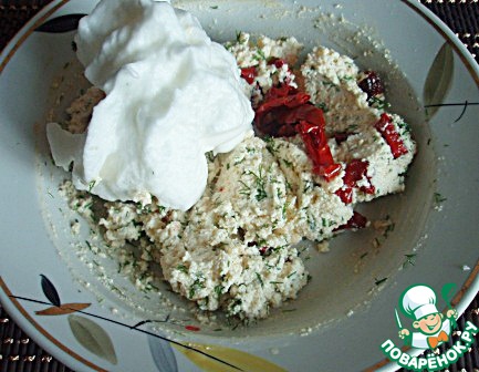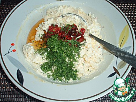 К творогу добавляем вяленые помидоры, порезанную зелень и чеснок (его добавляем по вкусу и если хотите) и оливковое масло. Вместо оливкового масла можно добавить масло из вяленых помидоров. Перемешиваем.