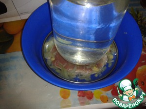 Мясо посолить, поперчить, добавить приправу (только совсем чуть-чуть, чтобы подчеркнуть вкус мяса, а не перебить его). Нарезать лук полукольцами, добавить к мясу и хорошенько размeшать все вместе. Накрыть плоской крышкой или небольшой тарелкой и сверху поставить груз (я поставила банку с водой). Оставить мариноваться хотя бы на 30 мин.-1 час. За это время включить духовку на 200-210 градусов, чтобы прогрелась, и подготовить противень (я застилаю пергаментом).