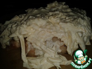 Дальше быстро положить стейк на противень (не давая ему возможности остывать) и выложить сверху сыр со сметаной.