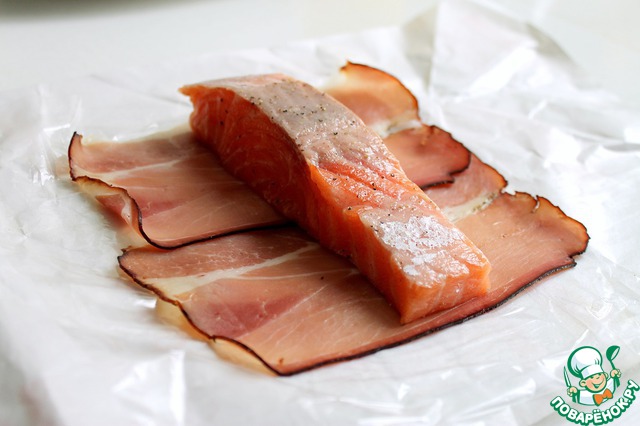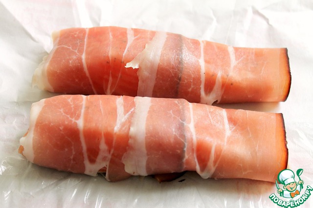 Берем 2 кусочка ветчины на каждый кусочек рыбы, хорошенько заворачиваем.