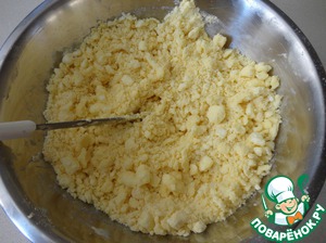 Соединяем оба вида муки, разрыхлитель и охлажденное сливочное масло. Рубим ножом, чтобы образовалась крошка.
