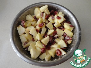 Для начинки чистим яблоки, режем их. Соединяем с клюквой, 2 ст. л. сахара и крахмалом. Перемешиваем.