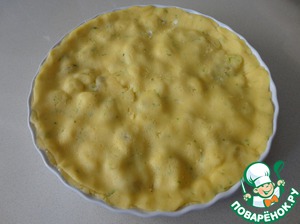 Сверху накрываем оставшимся тестом. Чтобы сделать это было легче, тесто я раскатала на листе кондитерской бумаги, а затем просто перевернула лист и аккуратно отлепила тесто от бумаги.