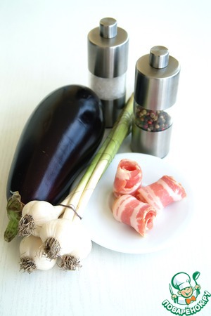 Полоски бекона разрезать на ширину кружков баклажана. В каждый надрез положить полоску бекона, тоненький слайс чеснока. Чтобы баклажан не развалился во время запекания, его нужно сколоть деревянной шпажкой.