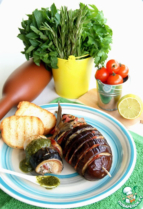 Скрутить рулетом. Сбрызнуть хорошо оливковым маслом, соком лимона. Посолить, поперчить. Запекать на открытом гриле тоже в конвертах из фольги до готовности. В духовке при 190* на верхнем гриле около 30 минут.