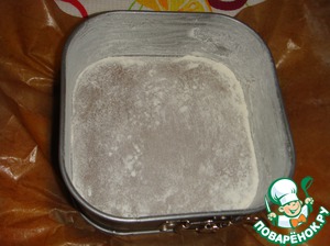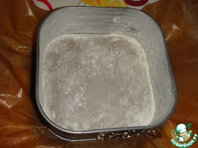 Смазать форму для выпечки (18Х18 см), дно которой выложено бумагой для выпечки, сливочным маслом и присыпать мукой.