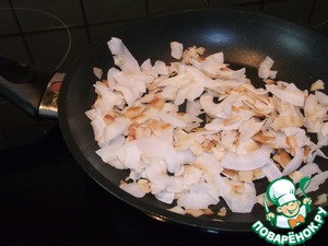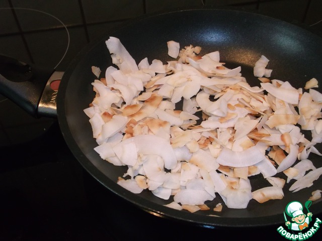 На сухой сковороде слегка подрумяниваем кокосовые чипсы.