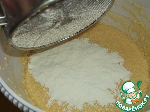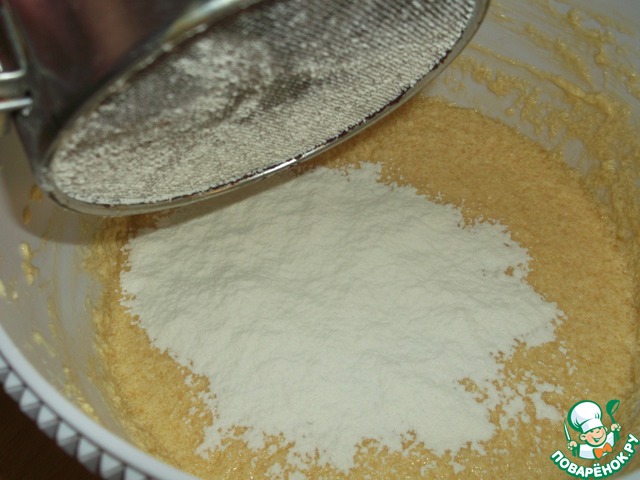 Муку смешиваем с разрыхлителем, просеиваем через сито, вводим в тесто. Тесто тщательно перемешиваем.