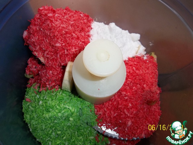 При помощи блендера все хорошо измельчить. Масса должна получится густая, если нет, то добавьте ещё кокосовой стружки.