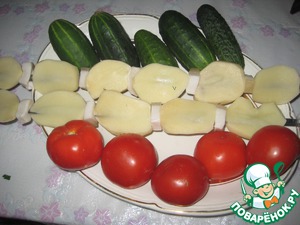 Картофель очень тщательно помыть, очистить от шкурки. Если картофель молодой - можно шкурку оставить. Нарезать картофель на пластинки шириной в 1,5-2 см (не забудьте ориентироваться на свой шампур - чтобы картофель плотно сидел на шампуре и не лопался при жарке).